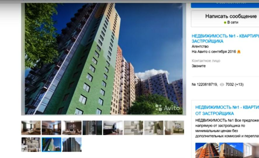 Видно, что размещено много фотографий различных зон квартиры, а также видна планировка и дом где предлагается приобрести квартиру целиком.