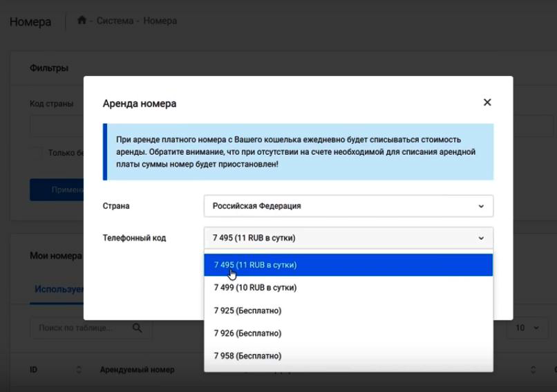 После регистрации вы попадете в свой рабочий кабинет где вам нужно взять номер телефона для работы. Вам нужно перейти в раздел номера. Следует нажать на кнопочку арендовать номер. Далее выбираете в страну.Российская федерация, США, Великобритания и т.д. Но вполне достаточно России. Выбирайте бесплатный номер.